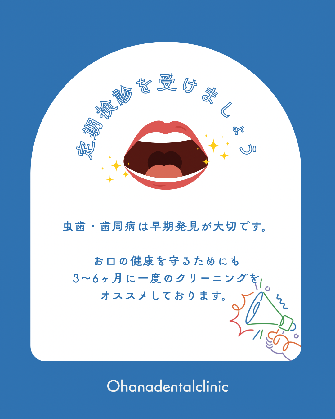 こんにちはohanadentalclinicです🦷 皆さん定期検診は受けていますか? セルフケアだけでは行き届かない箇所をクリーニングすることで、 虫歯や歯周病の早期発見に繋がります。 3〜6ヶ月に一度のクリーニングをオススメしております♪ 一緒にお口の健康を守りましょう🪥✨ ご相談等ございましたらお気軽にご相談くださいね☆